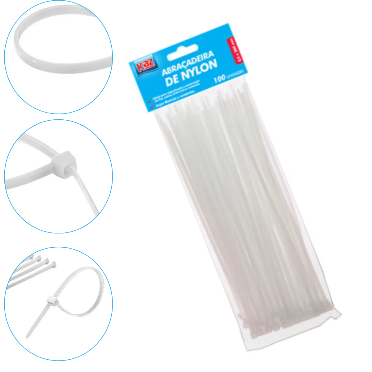 A Abraçadeira de Nylon é a solução prática, segura e eficiente para organização, amarração e fixação de fios, cabos, mangueiras, sacos, entre outros. Produzida em nylon de alta resistência, garante durabilidade, firmeza e facilidade de uso em diversas aplicações.