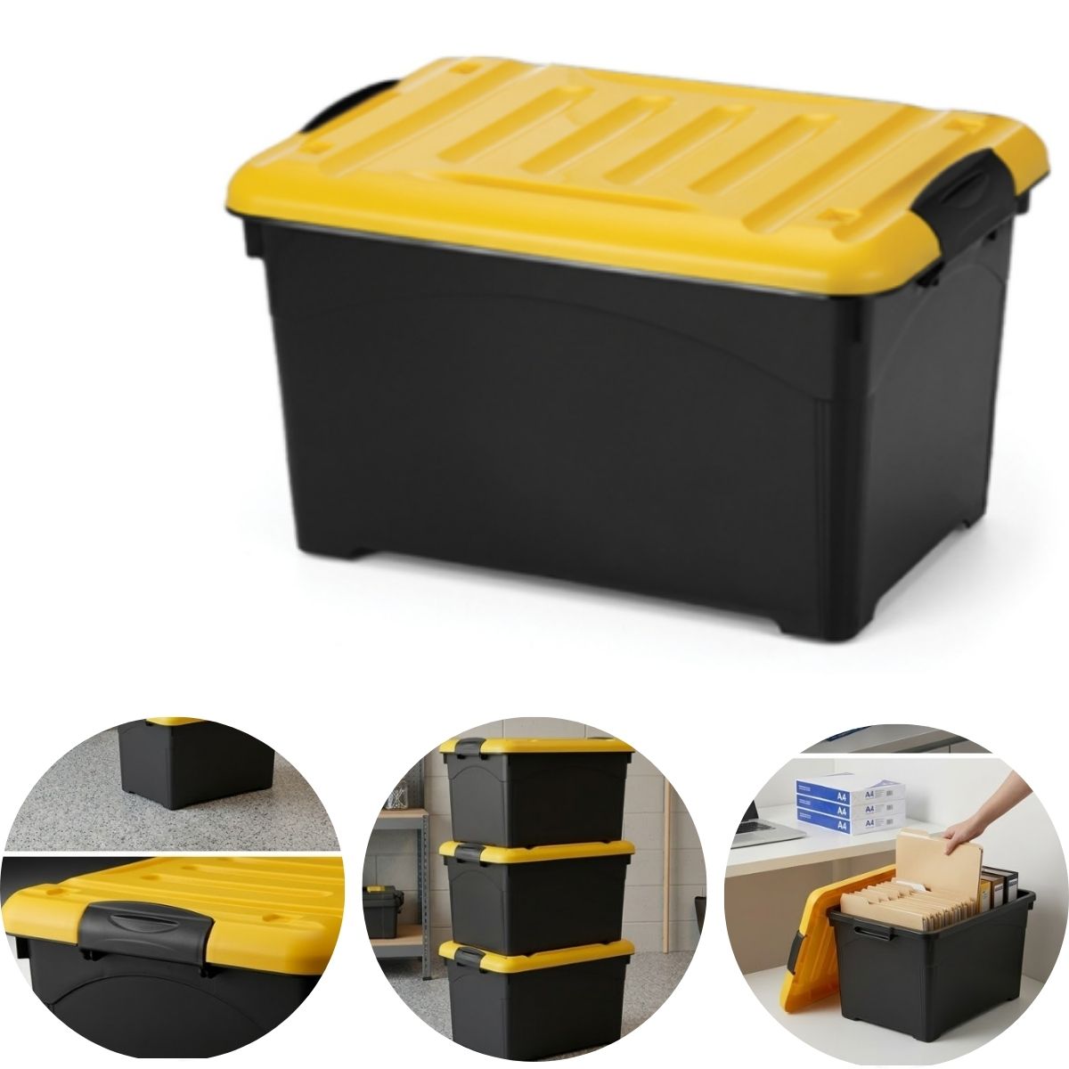A Caixa Organizadora de 95 Litros com Tampa e Travas Amarelas é perfeita para quem precisa de grande capacidade de armazenamento com segurança e praticidade. Ideal para organizar roupas, brinquedos, ferramentas, documentos ou itens de estoque, mantendo tudo protegido e bem organizado.