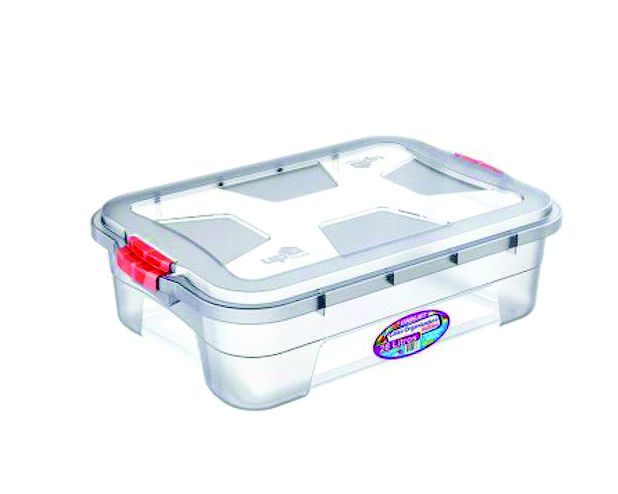 Caixa Organizadora Em Polipropileno 28 Litros Uninjet Disponível -Transparente com travas coloridas (Cores das travas laterais são enviadas aleatoriamente, caso prefira escolher consultar disponibilidade) 58cm (C) x 40Cm (L) x 16,5cm (A)