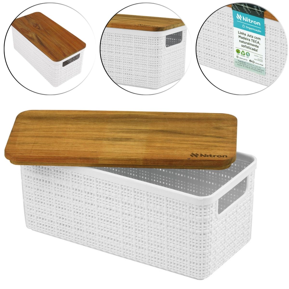 Com design alongado e estrutura firme, o cesto é ideal para ambientes compactos ou nichos de armários, proporcionando armazenamento inteligente sem abrir mão do estilo. Sua tampa de madeira teca garante proteção contra poeira e mantém os objetos sempre organizados, além de adicionar um charme rústico e acolhedor ao ambiente.