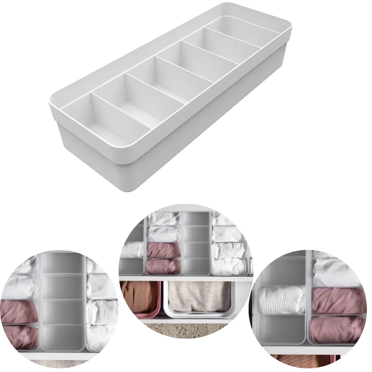 Pequenos cuidados com seu lar fazem toda a diferença. #Otimize Espaço nas Gavetas #Colmeia Logic Grande #Gaveta Organizada Peso: 190g / Cor: Terracota, Rosa Quartzo, Verde Menta, Branco, Natural, Chumbo / Ref: OL950G Dimensões: 34cm (C) x 12cm (L) x 7,5cm (A) Dimensões das 6 divisórias: 5,5cm (C) x 11cm (L) x 4,5cm (A) Cuidados: Lavar com água, sabão neutro e evitar produtos químicos ou abrasivos. Material: - Polipropileno: Material com alta resistência a impactos e ao calor. Não transfere odor, nem gosto aos alimentos. Atóxico, pode entrar em contato com alimentos. Resistência à água fervente, suportando até 150° C. Para quem procura organização e ama deixar tudo em ordem, este organizador colmeia facilita na hora de organizar e localizar suas meias, calcinhas, cuecas, meias-calças, lenços, gravatas, cintos ou até mesmo pequenos acessórios. Além de manter a sua gaveta organizada, este organizador colmeia agrega beleza e um aspecto moderno por possuir tons neutros. Organize com produtos de qualidade.