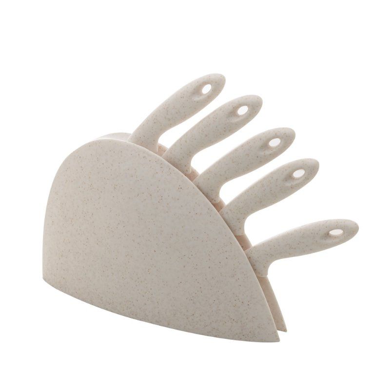 Produto ecologicamente correto, além de útil no seu dia a dia. O jogo contéms 5 facas e suporte facilitando a armazenagem e decorando sua cozinha.