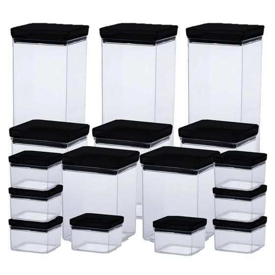 Kit 16 Potes Hermeticos Quadrados Empilhaveis de Acrilico Atoxico Lumini Black Original