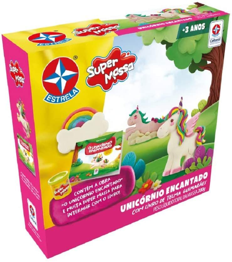 Itens Inclusos: 01 livro interativo, 02 moldes de unicórnios, 01 forma com figuras diversas, 01 extrusora, 01 rolinho, 01 faca e 01 potes de Super Massa em cores diferentes.