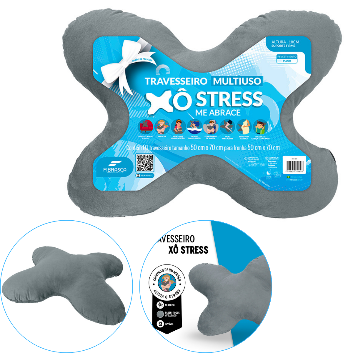 O travesseiro Xô Stress Fibrasca é a opção perfeita para quem deseja conforto, envolvimento anatômico e maciez em um só produto. Possui o formato em "X" que permite multiplas funções além de travesseiro convencional para cabeça e para o corpo, é uma ótima opção sendo almofada de decoração, apoio para amamentação, apoio para barriga de gestantes e um excelente travesseiro de viagem.